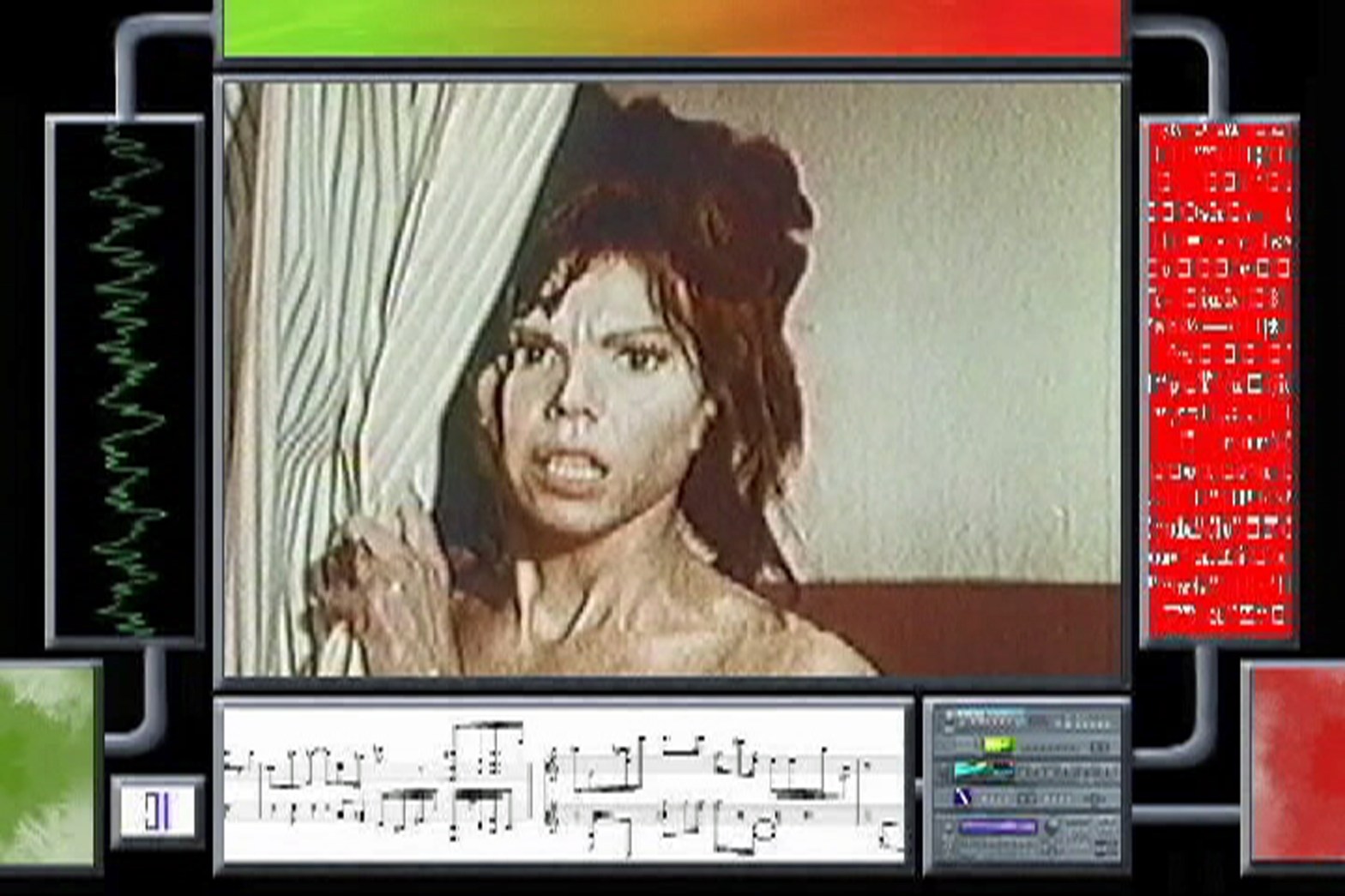 Six-hundred-five film clips are assembled and used to create a piece of electronic music. As the visual component appears in the center of the screen, the original analog audio is sent to the left channel while it is simultaneously converted into digital music data and sent to the right channel.