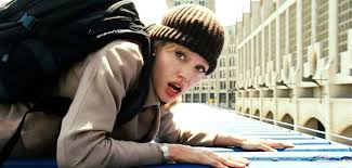 Salt (Angelina Jolie) jumps from truck to truck on the freeway, steals a motorcycle and successfully evades the agents chasing her.