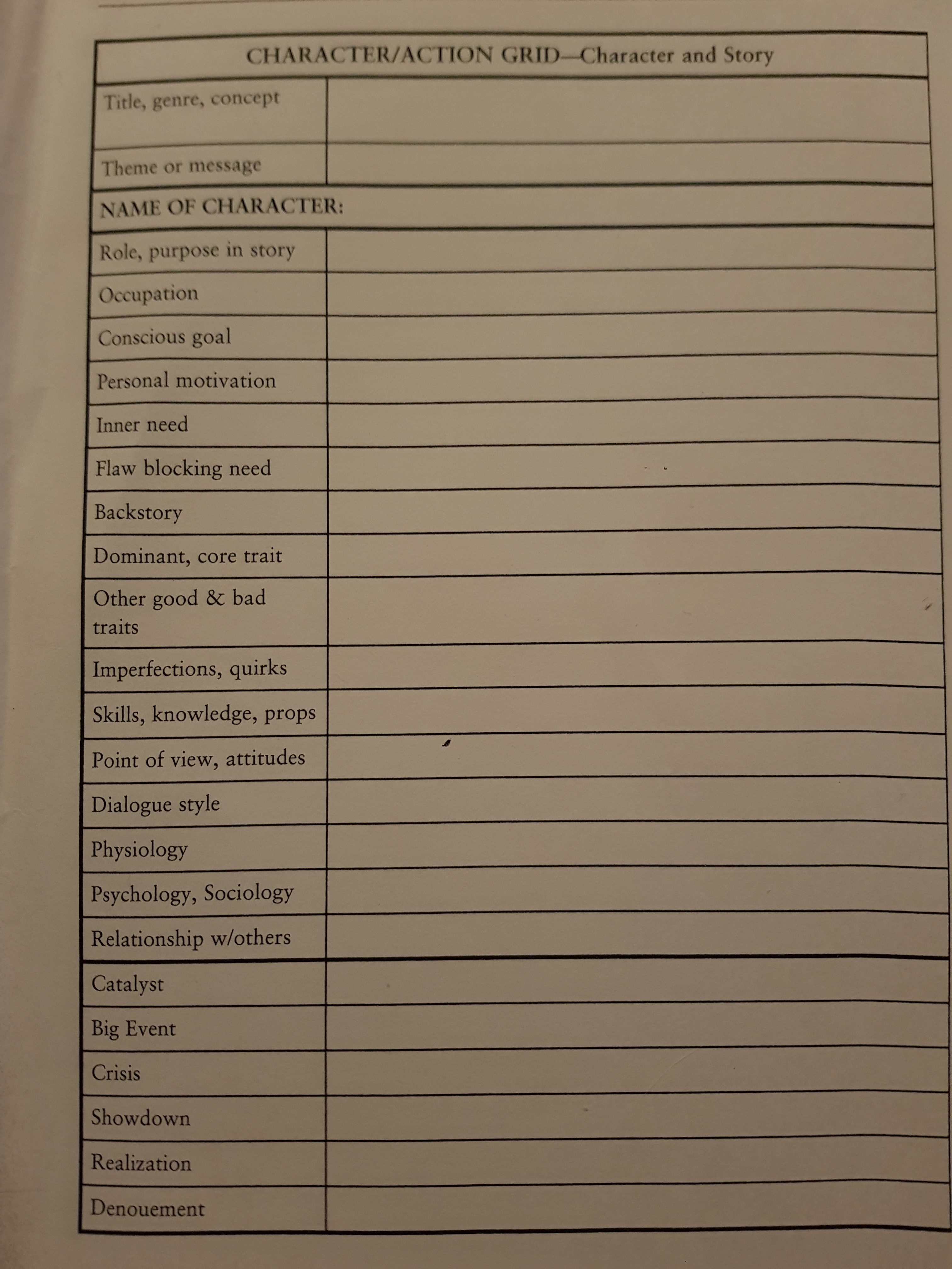 This grid is helpful for those who need to discover who their characters really are. It was for screenwriting but you can apply it to novel writing.