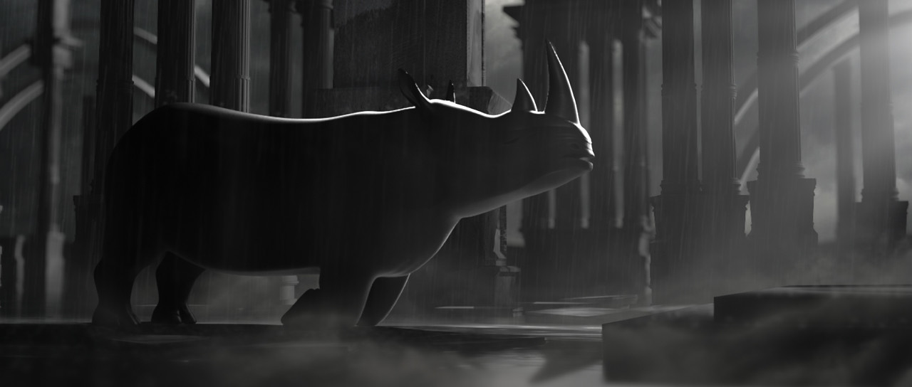 A rhino is walking into the ruins of a cathedral under a heavy rain.