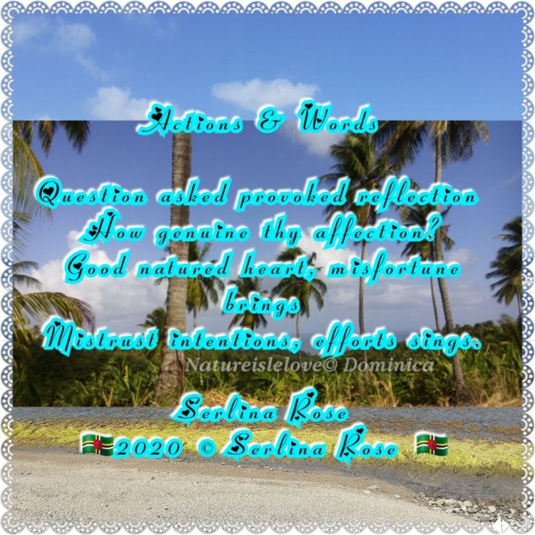 Question asked provoked reflection How genuine thy affection? Good natured heart, misfortune brings Mistrust intentions, efforts sings. Serlina Rose 🇩🇲2020 © Serlina Rose 🇩🇲 IG: @GoalChaser767