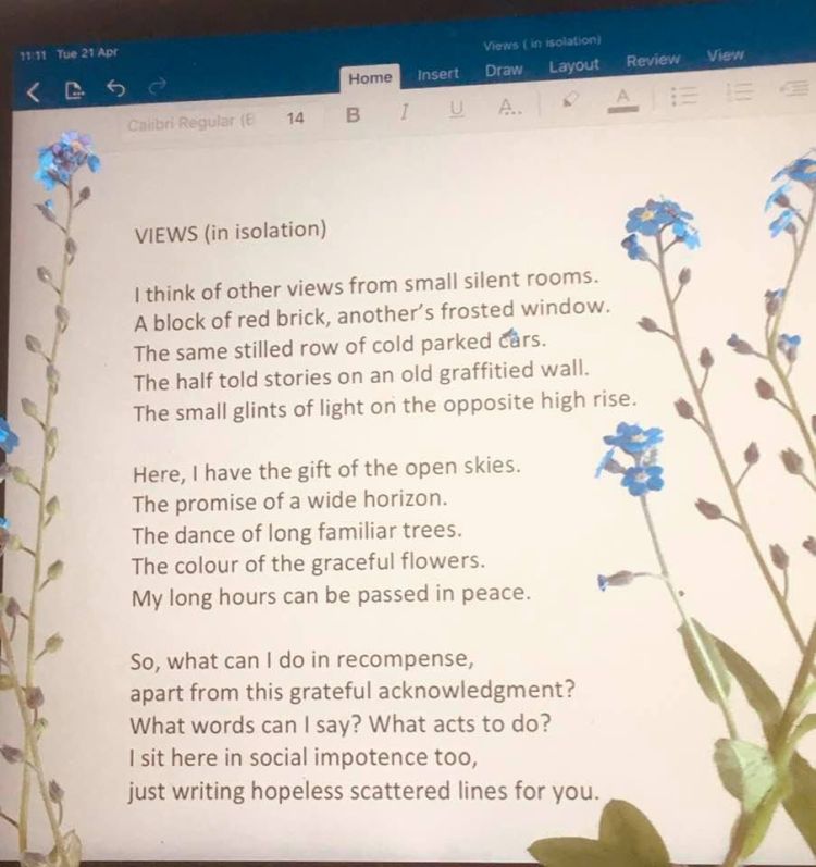 The poet, Kim Ridgeon has written very movingly about isolation. Like me, he worries about those whose views, in isolation, are just bricks and graffiti, who have nowhere beautiful to walk and he expresses that so clearly. He feels he wants to do something, as we all do, and here he is, doing something – […]
