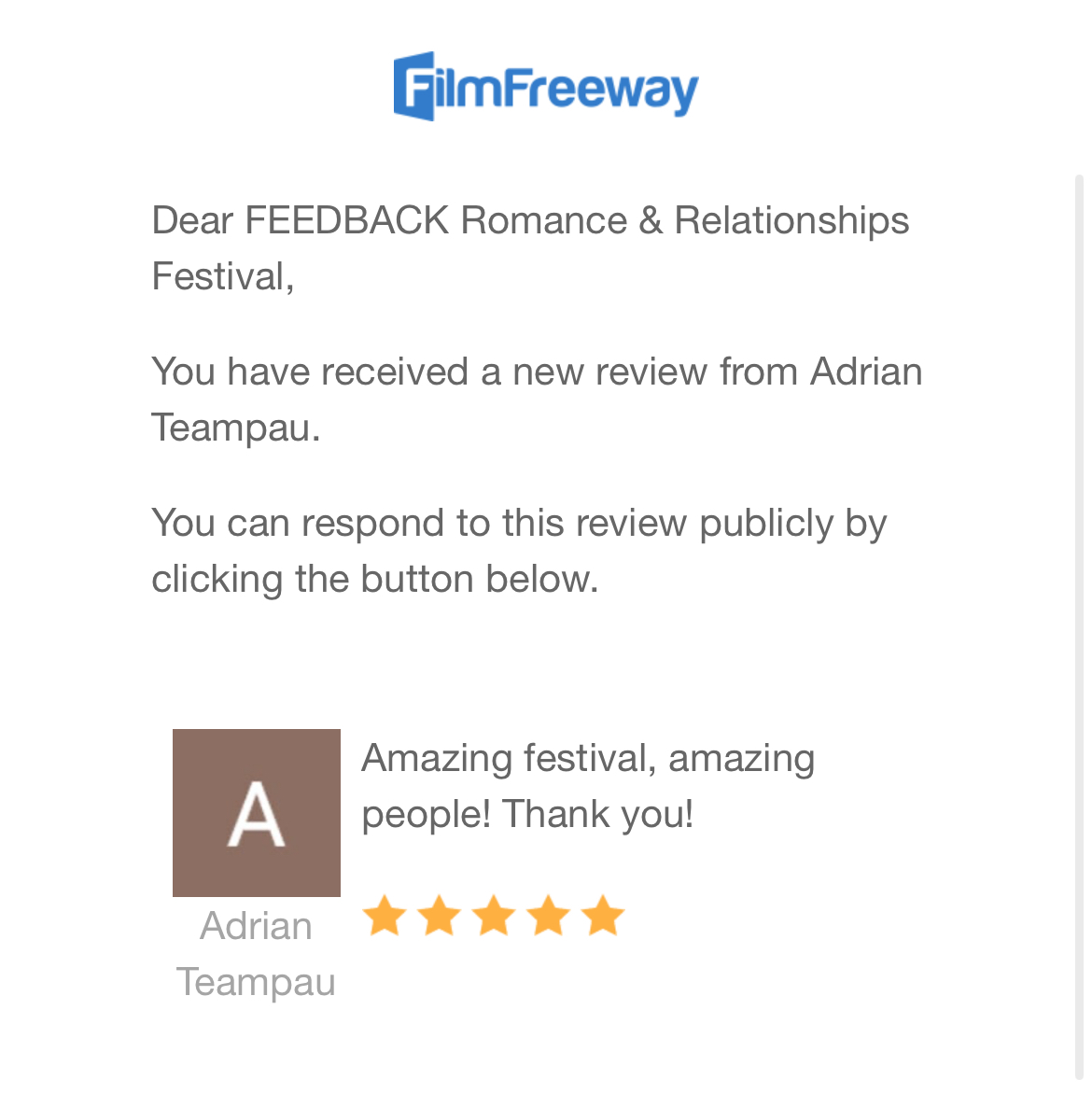 Today’s FilmFreeway Testimonial: ROMANCE/RELATIONSHIPS Film & Screenplay Festival