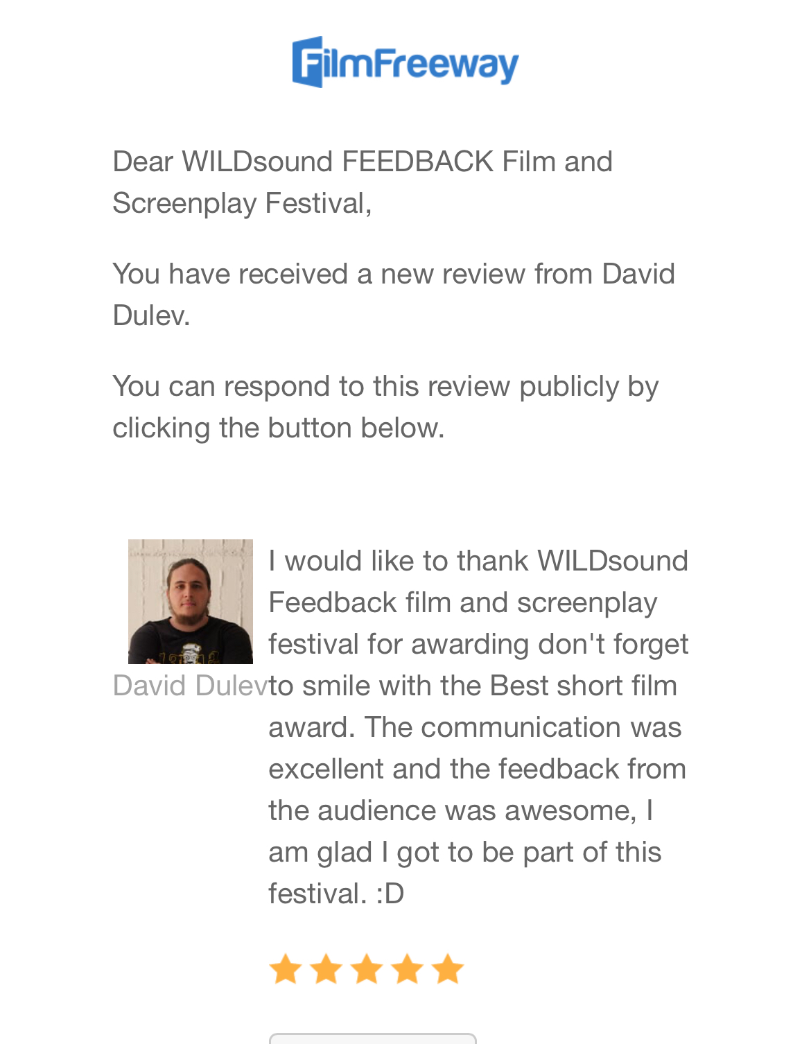 I would like to thank WILDsound Feedback film and screenplay festival for awarding don’t forget to smile with the Best short film award. The communication was excellent and the feedback from the audience was awesome, I am glad I got to be part of this festival. 😀