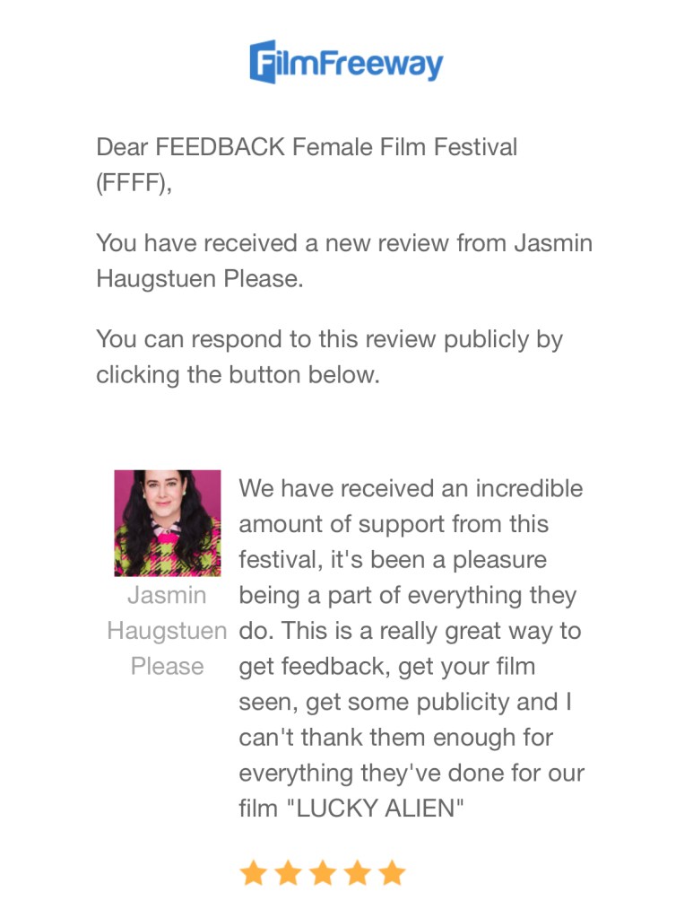 We have received an incredible amount of support from this festival, it’s been a pleasure being a part of everything they do. This is a really great way to get feedback, get your film seen, get some publicity and I can’t thank them enough for everything they’ve done for our film “LUCKY ALIEN”