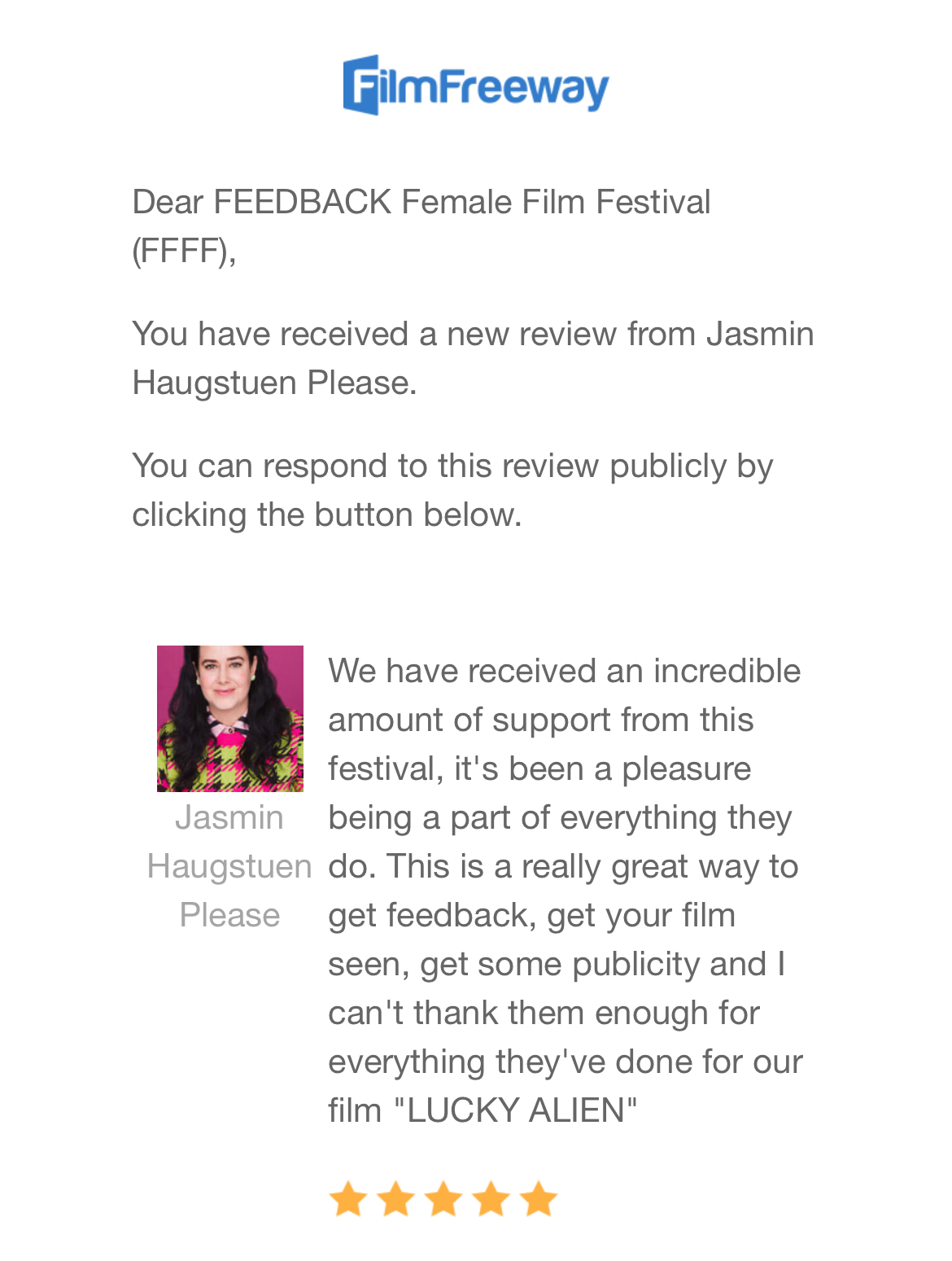 We have received an incredible amount of support from this festival, it’s been a pleasure being a part of everything they do. This is a really great way to get feedback, get your film seen, get some publicity and I can’t thank them enough for everything they’ve done for our film “LUCKY ALIEN”