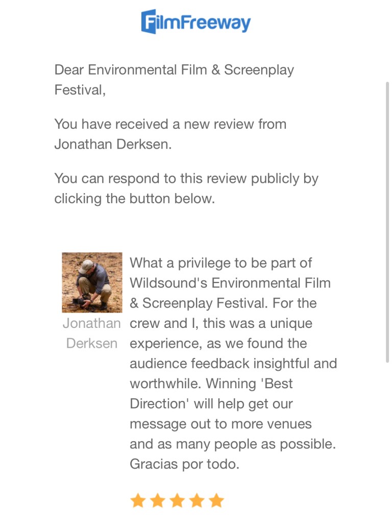 What a privilege to be part of Wildsound’s Environmental Film & Screenplay Festival. For the crew and I, this was a unique experience, as we found the audience feedback insightful and worthwhile. Winning ‘Best Direction’ will help get our message out to more venues and as many people as possible. Gracias por todo.