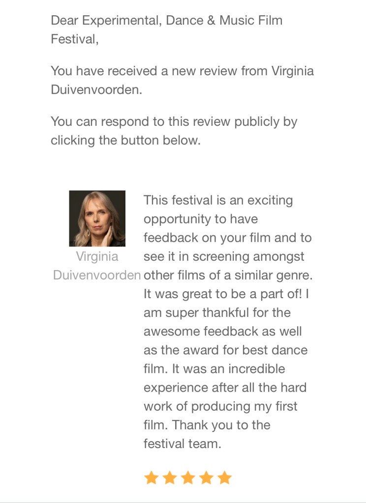 This festival is an exciting opportunity to have feedback on your film and to see it in screening amongst other films of a similar genre. It was great to be a part of! I am super thankful for the awesome feedback as well as the award for best dance film. It was an incredible experience after all the hard work of producing my first film. Thank you to the festival team.
