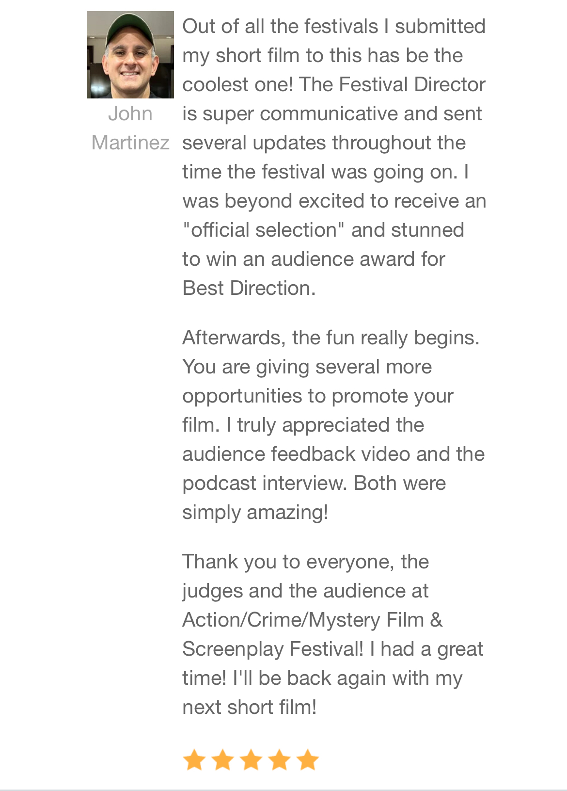 Thank you to everyone, the judges and the audience at Action/Crime/Mystery Film & Screenplay Festival! I had a great time! I’ll be back again with my next short film!