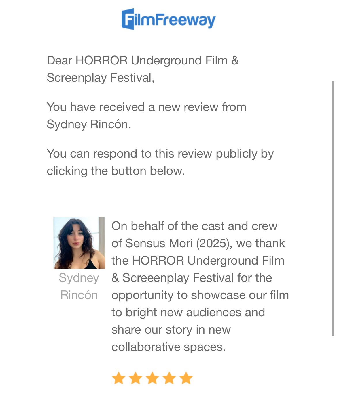 On behalf of the cast and crew of Sensus Mori (2025), we thank the HORROR Underground Film & Screeenplay Festival for the opportunity to showcase our film to bright new audiences and share our story in new collaborative spaces.