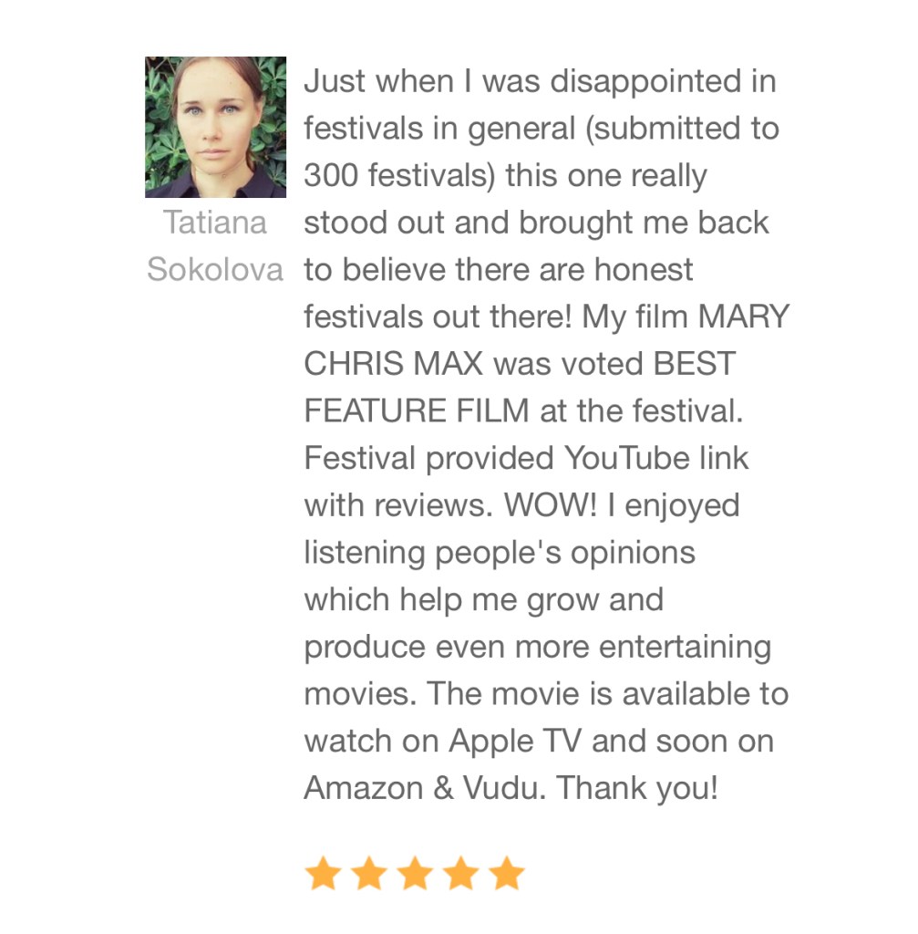 Just when I was disappointed in festivals in general (submitted to 300 festivals) this one really stood out and brought me back to believe there are honest festivals out there! My film MARY CHRIS MAX was voted BEST FEATURE FILM at the festival. Festival provided YouTube link with reviews. WOW! I enjoyed listening people’s opinions which help me grow and produce even more entertaining movies. The movie is available to watch on Apple TV and soon on Amazon & Vudu. Thank you!