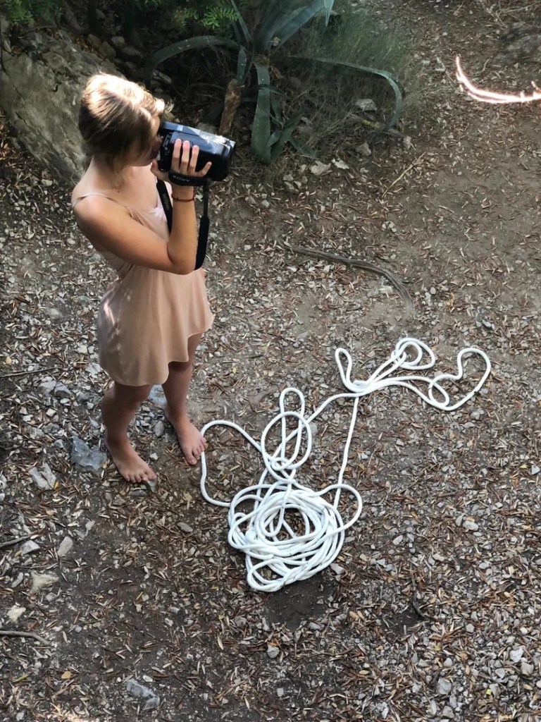 At the crucial moment, She is handed a camera and her body jerks. It is the initiating moment when She begins to take life into her own hands. Now the shots start to change (objective / subjective view). Her subjective shots are restless, insecure and vertical at first, but as the body slowly frees more and more, from lying down to upright, so the shots get longer, more stable, have more perspective, and are eventually horizontal, calm, while the process of the body goes in the opposite direction – it rises, breathes with full lungs, the colors return, the voices of nature suppress unnatural sounds… The last sound is the original sound from the recording: the crickets sing out loud. In the end, the body stands firmly on the ground, the camera makes a 360-degree circle, the space expands in all directions, time spins again. She is holding her life in her hands and is self-confident again.
