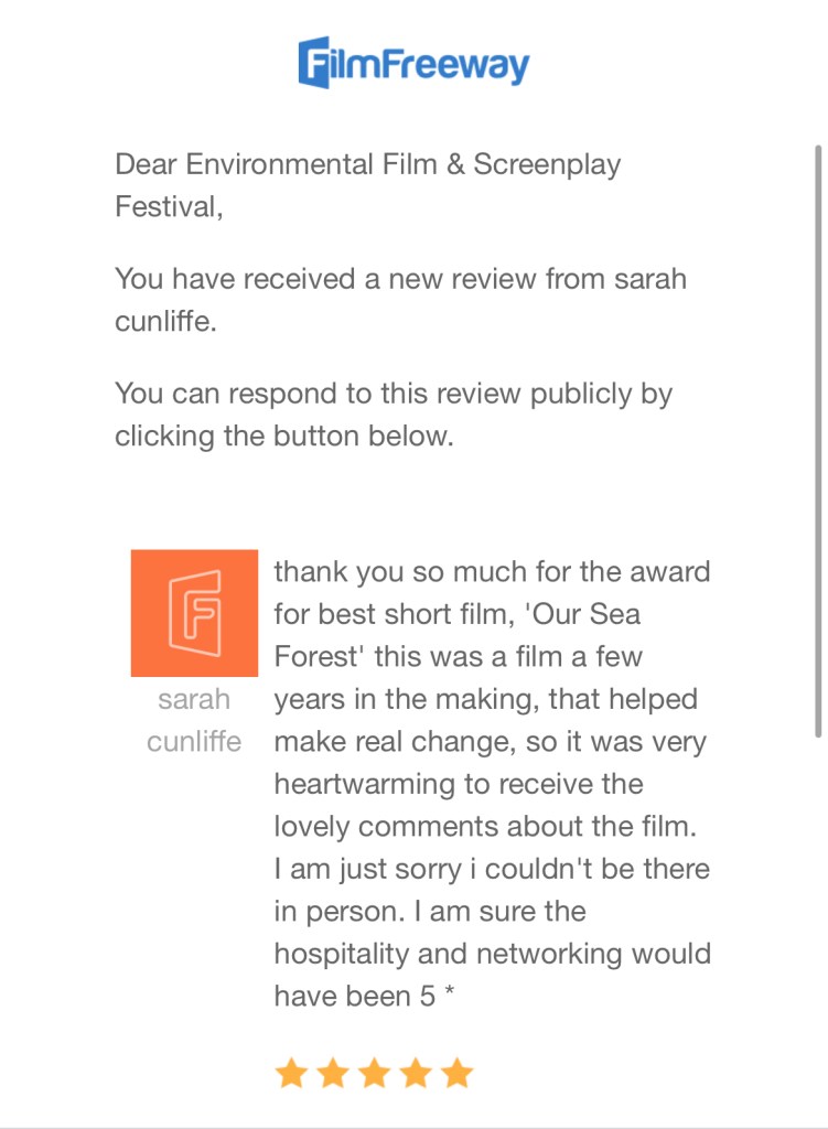 thank you so much for the award for best short film, ‘Our Sea Forest’ this was a film a few years in the making, that helped make real change, so it was very heartwarming to receive the lovely comments about the film. I am just sorry i couldn’t be there in person. I am sure the hospitality and networking would have been 5 *