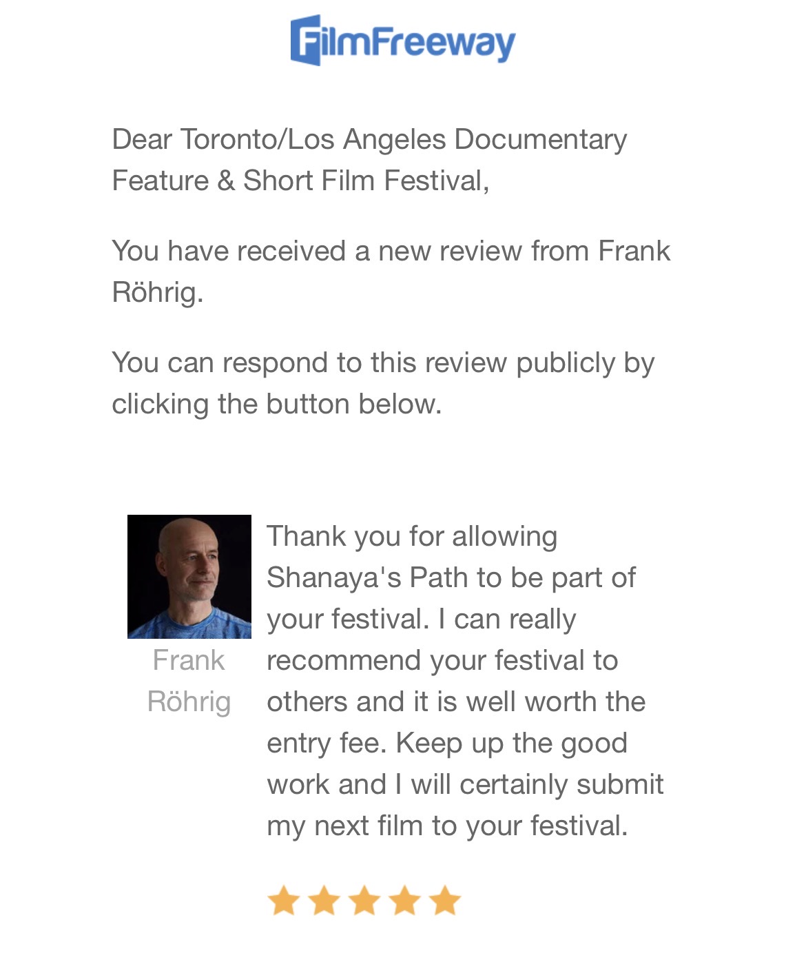 Thank you for allowing Shanaya’s Path to be part of your festival. I can really recommend your festival to others and it is well worth the entry fee. Keep up the good work and I will certainly submit my next film to your festival.