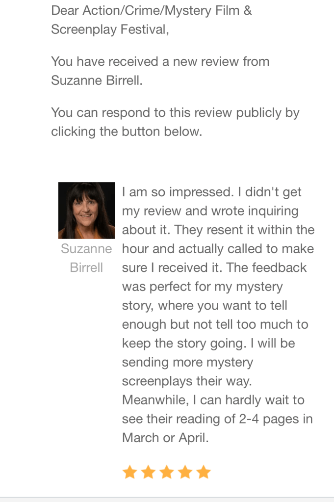 “The Action/Crime/Mystery Film & Screenplay Festival is definitely worth your time! They provide invaluable resources for filmmakers, and they also are very helpful while recognizing your work. I recommend.”
