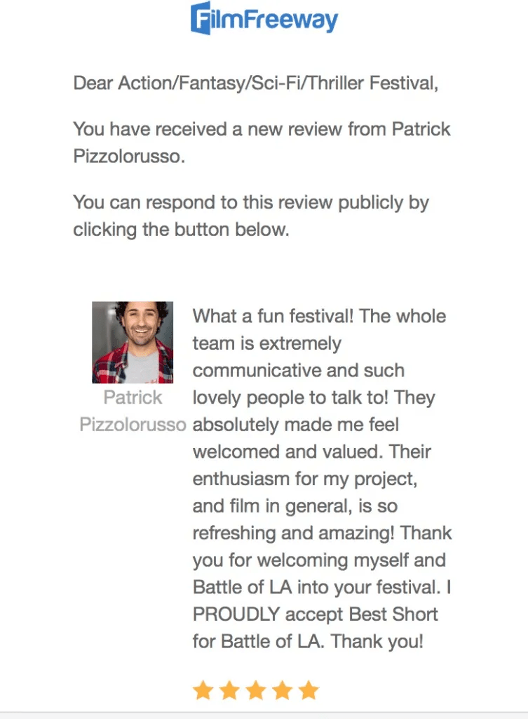 Tier #1 – Your film plays at a public film festival event where the audience will record their comments/reactions to your film on their camera or phone, then we edit them and send you a promotional video. No matter what you will receive a promotional video of your film of people commenting on your film.