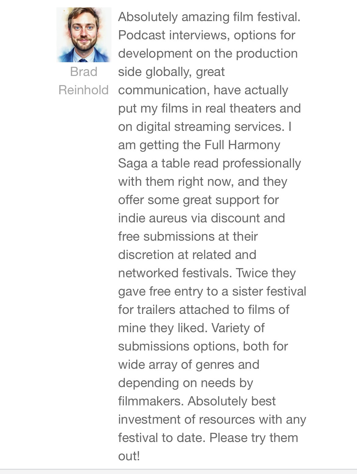 Absolutely amazing film festival. Podcast interviews, options for development on the production side globally, great communication, have actually put my films in real theaters and on digital streaming services. I am getting the Full Harmony Saga a table read professionally with them right now, and they offer some great support for indie aureus via discount and free submissions at their discretion at related and networked festivals. Twice they gave free entry to a sister festival for trailers attached to films of mine they liked. Variety of submissions options, both for wide array of genres and depending on needs by filmmakers. Absolutely best investment of resources with any festival to date. Please try them out!