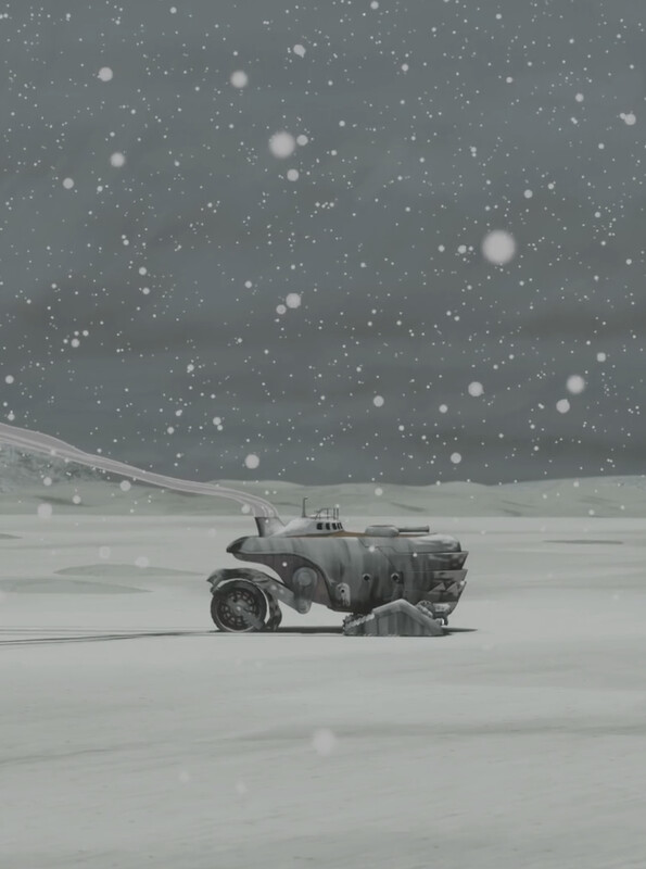 An old war machine treads through a snowy wasteland. But it isn’t alone…