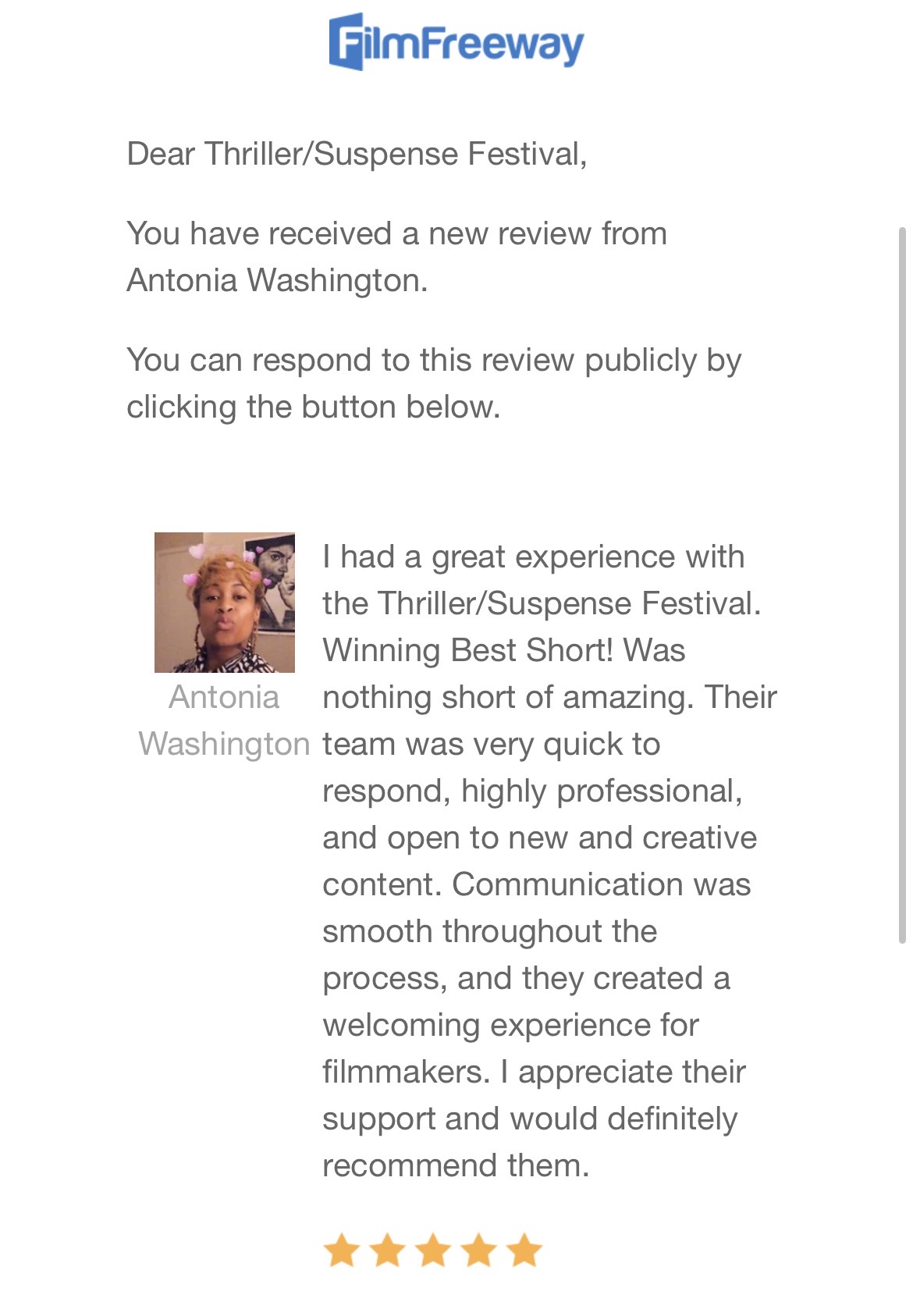 I had a great experience with the Thriller/Suspense Festival. Winning Best Short! Was nothing short of amazing. Their team was very quick to respond, highly professional, and open to new and creative content. Communication was smooth throughout the process, and they created a welcoming experience for filmmakers. I appreciate their support and would definitely recommend them.